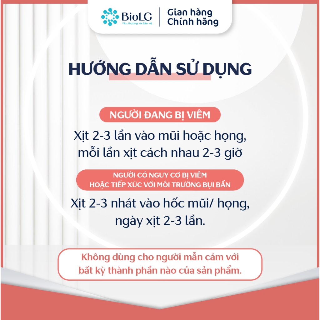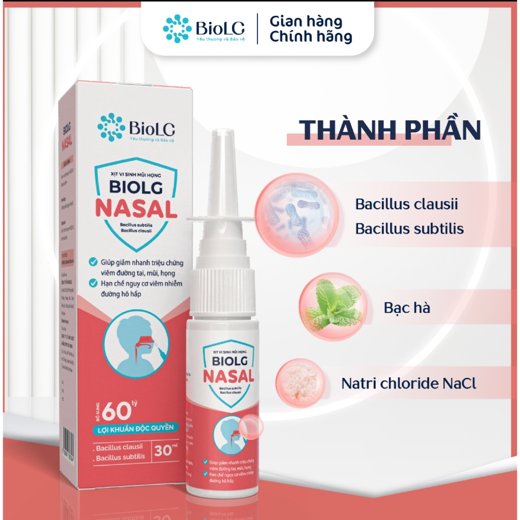 BioLG Nasal – Xịt vi sinh mũi họng Giải pháp hỗ trợ làm sạch mũi, thông thoáng đường thở, an toàn dùng hằng ngày cho cả gia đình. ✔ Hỗ trợ giảm viêm mũi – viêm họng ✔ Giúp thông thoáng mũi, dễ chịu tức thì ✔ An toàn sử dụng lâu dài Thành phần nổi bật: Bacillus clausii – Bacillus subtilis – Bạc hà – NaCl tinh khiết 👉 Sản phẩm do DƯỢC PHẨM BIOTIC phân phối chính hãng Cam kết nguồn gốc rõ ràng – hàng chuẩn – giao nhanh. 📌 Dung tích: 30ml 📌 Đối tượng: Trẻ nhỏ & người lớn 📌 Dùng hằng ngày hoặc khi môi trường bụi bẩn Xịt vi sinh tai mũi họng BioLG Nasal bổ sung 60 tỷ lợi khuẩn (Chai 30ml) - Dược Phẩm Vitath THÔNG TIN CHI TIẾT - Thương hiệu: BioLG - Quy cách đóng gói: Chai 30ml - HSD: 2 năm kể từ ngày sản xuất - Xuất xứ: Việt Nam - THÀNH PHẦN: + Bacillus clausii + Bacillus subtilis + Hương liệu (bạc hà) + NaCl + Nước vừa đủ ĐỐI TƯỢNG SỬ DỤNG - Sản phẩm dùng an toàn cho trẻ sơ sinh và trẻ nhỏ. - Người bị các vấn đề về tai, mũi họng hoặc có nguy cơ. - Người thường xuyên tiếp xúc với môi trường bụi bẩn hoặc đang sử dụng kháng sinh. MÔ TẢ SẢN PHẨM 1. Nồng độ lợi khuẩn cao, lên tới 60 tỷ lợi khuẩn/30ml, lấn át hại khuẩn, bắt giữ vi rút gây các vấn đề về đường hô hấp, khôi phục niêm mặc mũi 2. Probiotics dạng xịt, độc đáo, tác dụng nhanh, tiện lợi 3. Chủng lợi khuẩn độc quyền, bền thời gian & nhiệt độ, có khả năng bám dính cao tại niêm mạc 4. Kích thích sản xuất kháng thể IgA tại niêm mặc đường hô hấp, ngăn chặn sự xâm nhiễm của các tác nhân gây hại như virus, vi khuẩn. 5. Dùng cho mọi lứa tuổi, cả trẻ em và phụ nữ mang thai, đang cho con bú. CÔNG DỤNG CỦA SẢN PHẨM - Giúp vệ sinh tai, mũi, họng. - Hỗ trợ làm giảm các triệu chứng nghẹt mũi, v.i.ê.m mũi, v.i.ê.m tai, xoang, dị ứng theo mùa. - Giúp bổ sung bào tử lợi khuẩn, giúp hỗ trợ giảm nguy cơ mắc các vấn đề về đường tai, mũi, họng. *LƯU Ý: Thực phẩm này không phải là thuốc, không có tác dụng thay thế thuốc chữa bệnh. Không dùng cho người mẫn cảm với bất kỳ thành phần nào của sản phẩm. CÁCH DÙNG - Lắc kỹ ống trước khi dùng - Người đang bị v.i.ê.m: xịt 2-3 lần vào mũi hoặc họng, mỗi lần xịt cách nhau 2-3 giờ - Người có nguy cơ bị v.i.ê.m hoặc tiếp xúc với môi trường bụi bẩn: xịt 2-3 nhát vào hốc mũi/ họng, ngày xịt 2-3 lần. *BẢO QUẢN: - Nơi khô ráo, thoáng mát, tránh ánh nắng mặt trời, nhiệt độ dưới 30°C. - Để xa tầm tay trẻ em. CAM KẾT VỚI KHÁCH HÀNG Luôn mang tới những sản phẩm chất lượng, tốt cho sức khỏe đến với khách hàng Dịch vụ khách hàng của shop luôn tận tâm và nhiệt tình Thời gian chuẩn bị hàng luôn được đảm bảo Đổi trả sản phẩm nếu có lỗi từ nhà sản xuất theo quy định của Shopee (trong vòng 07 ngày kể từ khi nhận sản phẩm) *ĐỂ ĐẢM BẢO QUYỀN LỢI, QUÝ KHÁCH VUI LÒNG QUAY LẠI VIDEO KHI MỞ KIỆN HÀNG. Dược phầm Biotic - Rất hân hạnh được phục vụ quý khách. Quý khách hàng vui lòng liên hệ trực tiếp với shop để được giải quyết thắc mắc và vấn đề về sản phẩm (nếu có) Nhấp Follow shop để nhận thêm nhiều ưu đãi mã giảm giá từ shop nhé!